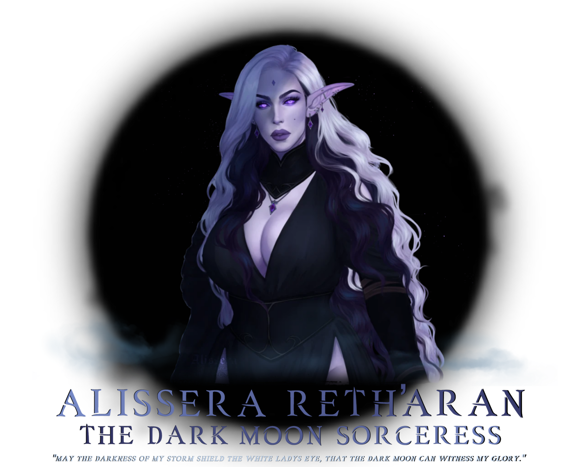 The de-facto Leader of Mythos, Alissera Reth'aran is a Sorceress of Highborne lineage who has served long years of vigil in guarding Azeroth from threats within and without - and yet has done so from the shadows. Her many deeds have gone unassociated with her name, until the name of Mythos was truly established, and her at its head. Nearly eight thousand years of age, her service began long ago in training with the Sentinels of Ashenvale, though the undeniable pull of magic always called to her Highborne blood.Giving up the ranks of the Sentinels in order to follow a path of the arcane storm, Alissera spent the years of Highborne persecution in hiding as a village herbalist and medic until her kind was able to practice unpersecuted once again. With the power and secrets of the race from which arcane usage was borne, Alissera has taken to a life of helping others; using her millennia of experience to guide these hopeful adventurers with wisdom and efficiency. Were there anything or anyone that stood between Alissera Reth'aran and those she cared for, those she loved, they would face the cataclysmic wrath of the Eye of the Storm herself.